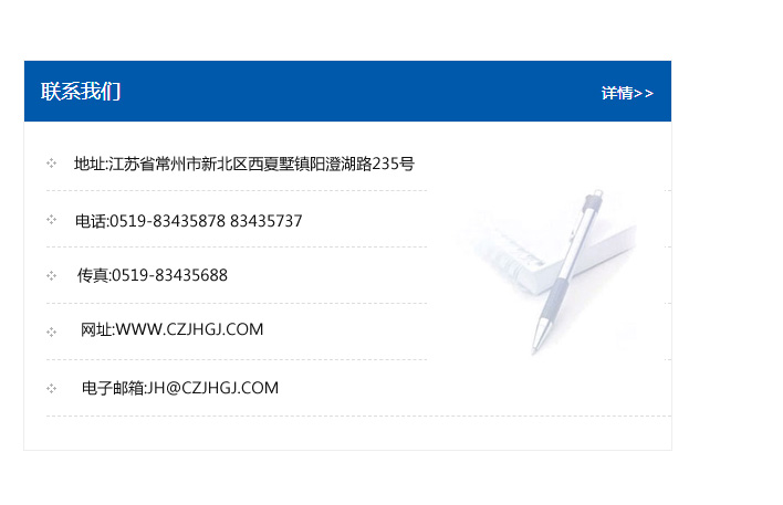 地址:常州市新北區友邦商務大廈1幢16、17層  電話:0519-85101652  傳真:0519-85112595  郵編:213022  網址:www_cz-jiayue_cn.tzruixiang.com  郵箱:xiajifengaa@163.com